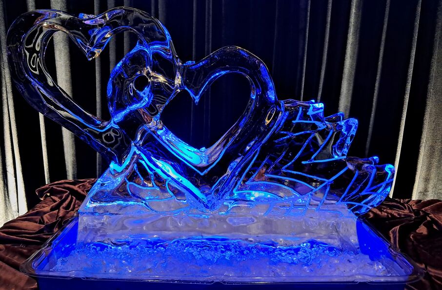 Wenn Sie nur einen Spritzer Eis wünschen, ist die freistehende Skulptur die traditionellste Option. Sie ist oft mit Liebessymbolen (Herzen, Ringe, Schwäne usw.) oder dem neuen Nachnamen oder den Initialen des Paares verziert. Laut Robert The Iceman dient diese Art von Stück meist als optischer Kontrapunkt zur Hochzeitstorte. Eine weitere kleinere Option könnten Blumen in Eis hängen, um Tischdekorationen eine einzigartige Note zu verleihen.