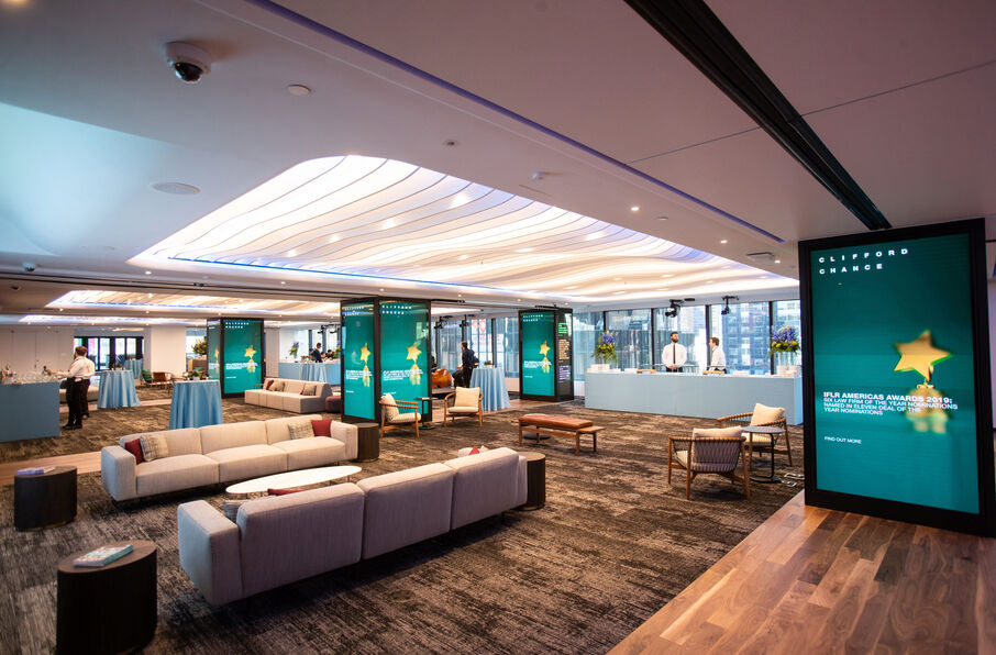 Nutzen Sie das engagierte AV-Team und eine Vielzahl digitaler Bildschirme von Nasdaq, um Ihre individuellen Eventgrafiken anzuzeigen und mit Ihren Programminhalten zu synchronisieren.