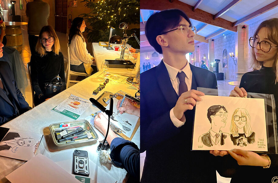 Ich bin professionelle Hochzeitsillustratorin und erfahrene Porträtkünstlerin für Veranstaltungen wie Firmenfeiern, Einweihungen, Hochzeiten und Geburtstage (privat und öffentlich). Ich halte die schönsten Momente von Hochzeiten und Events live auf Künstlerpapier mit einem Hauch von Aquarell fest. Manchmal arbeite ich digital, wenn die Zeichnungen live auf einer großen Leinwand projiziert werden. Diese illustrierten Berichte verewigen die Location, die Gäste, die Anekdoten und die Atmosphäre des Tages mit einer erzählerischen, fröhlichen und künstlerischen Dimension. Manchmal fertige ich ausschließlich Porträts an. In diesen Fällen richte ich einen Stand auf der Veranstaltung ein, eine Art „Porträtbar“ mit Drucker. Die Originalzeichnungen bleiben vor Ort. Eine digitale Version wird zum Teilen in sozialen Medien oder zur Erstellung von Büchern, Postern, Kalendern oder Tassen bereitgestellt. Die Zeichnungen werden am Veranstaltungstag selbst ausgestellt. Dies bietet den Gästen Unterhaltung und ermöglicht es ihnen, signierte Zeichnungen als Geschenke zu überreichen.