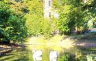 Außenansicht: uralte Bäume, Schwanenteich und Blick auf Schloss Bellemans.