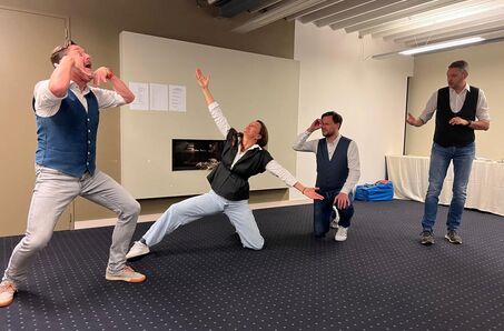 Professionelle Schauspieler stellen bekannte Geschäftssituationen live auf der Bühne dar und machen so Kommunikation, Zusammenarbeit und Teamdynamik sichtbar und diskussionswürdig.