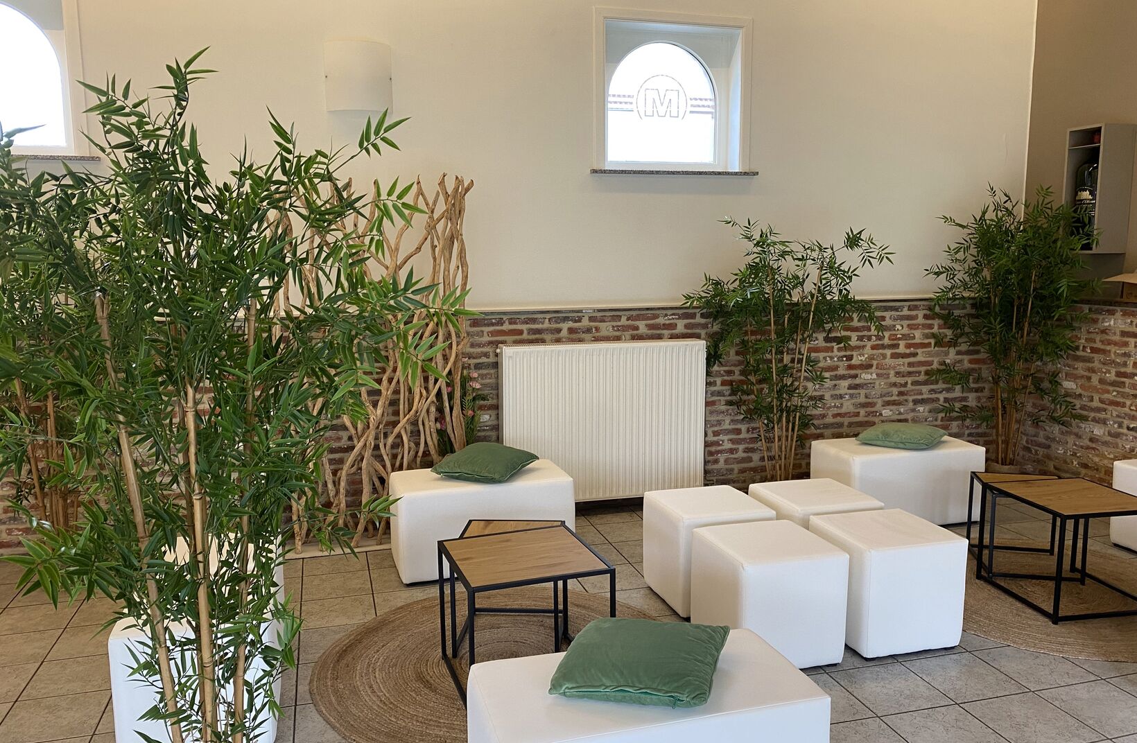 Weiß und Grün. Grün und Weiß. Teils Lounge, teils Stehtische, teils klassische Sitzgelegenheiten.
