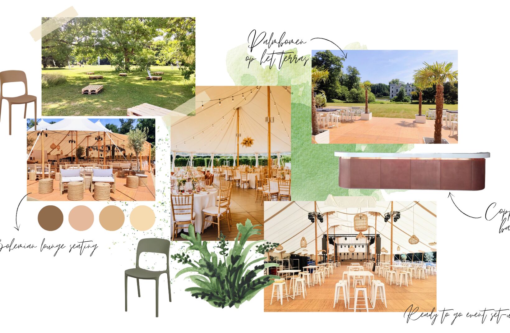 Unser Pop-Up-Zelt Silhouette ist standardmäßig mit Möbeln im Bohème-Stil und stilvollen Lounge-Sitzgelegenheiten ausgestattet. Ein warmer, entspannter Stil, der sich harmonisch in die grüne Umgebung des Botanischen Gartens einfügt.