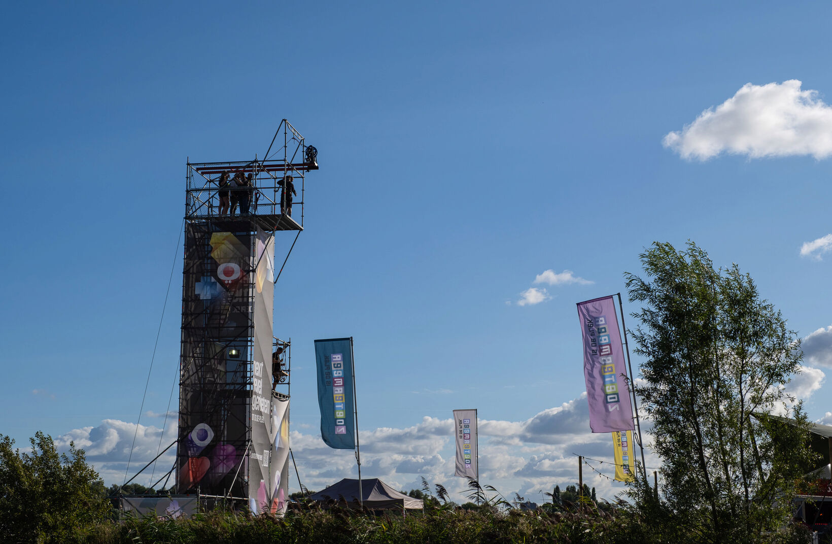 Die imposante Konstruktion überragte das Festivalgelände und zog sofort alle Blicke auf sich. Mit Blick auf den See nahmen die Teilnehmer auf der Schaukelinstallation Platz und schwebten anschließend hoch über der Menge hin und her.