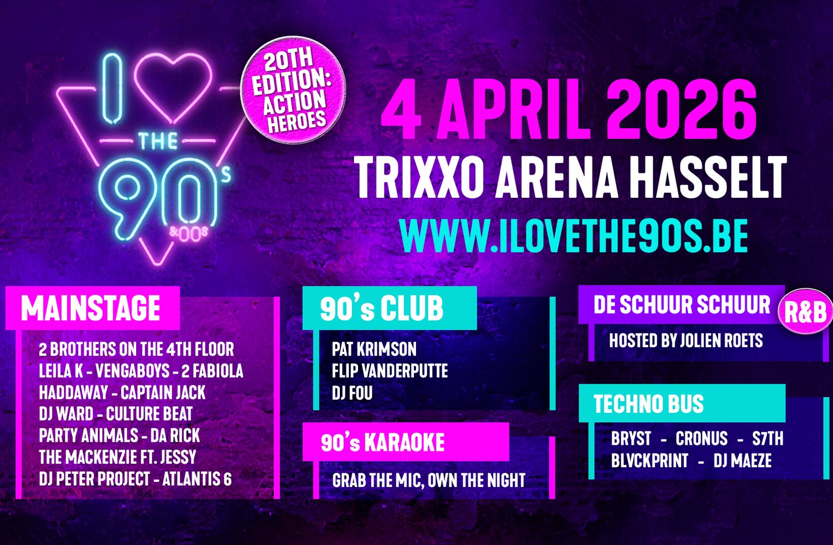 Am Samstag, den 4. April 2026, öffnet die Trixxo Arena Hasselt ihre Tore für die 20. Ausgabe von „I love the 90s – The party“. Ein Jubiläum, das nach einer besonders ausgelassenen Feier verlangt. Deshalb wird mit brandneuen Bühnen und Partyzonen (darunter 90er-Jahre-Karaoke, „De schuur Schuur“ (90er-Jahre-R&B), Techno-Bus u. v. m.), einem mitreißenden Actionhelden-Thema, einem besonderen Fokus auf das Erlebnis und einem gigantischen Line-up keine Mühen gescheut.