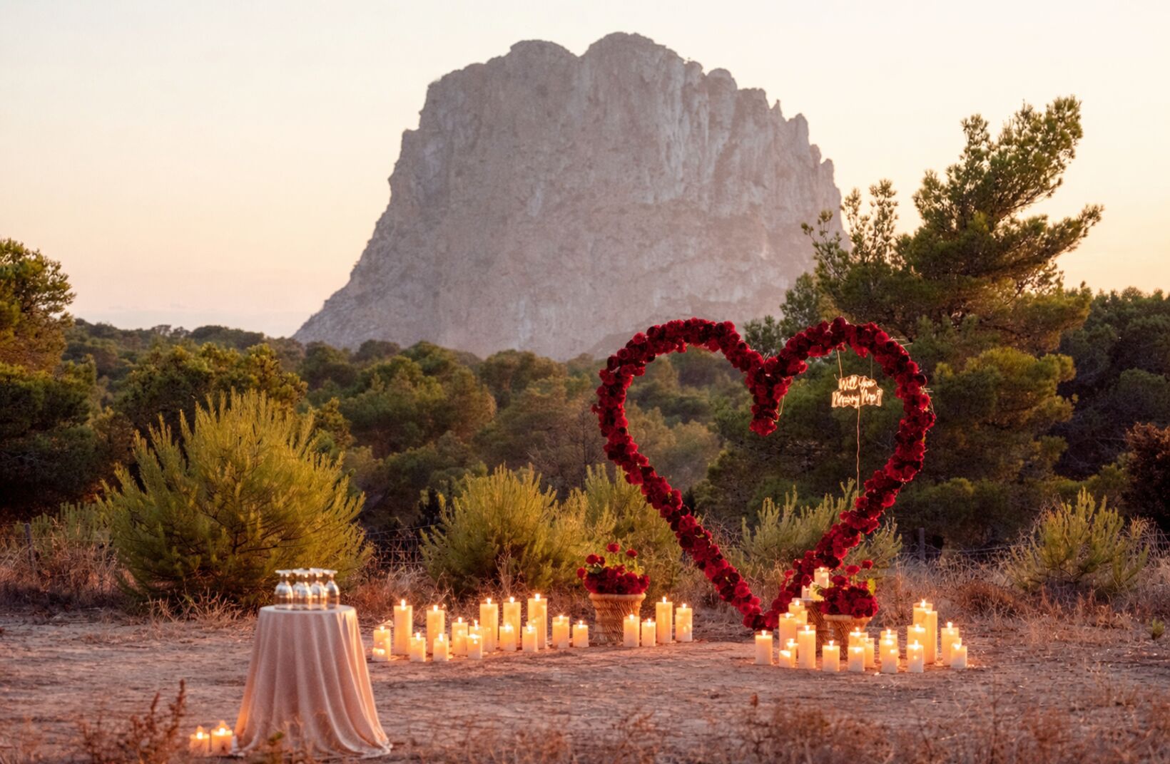 Wir bieten ein wunderschönes, großes rotes Rosenherz an einem einzigartigen, privaten Ort auf einer Wiese gegenüber von Es Vedrà… ein Ort, an dem Ruhe, Natur und Romantik zusammenkommen 🌿